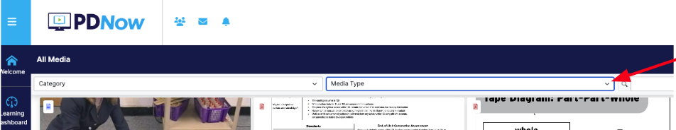The drop-down next to “Media Type” will allow you to view resources by different types of media, including audio, video, PDF, and external websites.